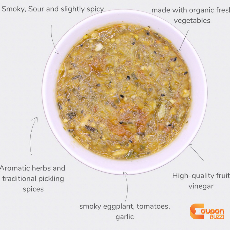 بادمجان کبابی، سبزیجات معطر، گوجه فرنگی فلفلی سبز، سیر، ادویه مخصوص، سرکه ارگانیک