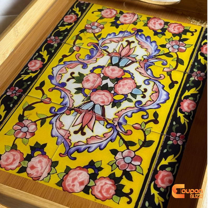 سینی ایرانی با طرح کاشی، ساخته شده از چوب بامبو، رزین و ورق طلا.